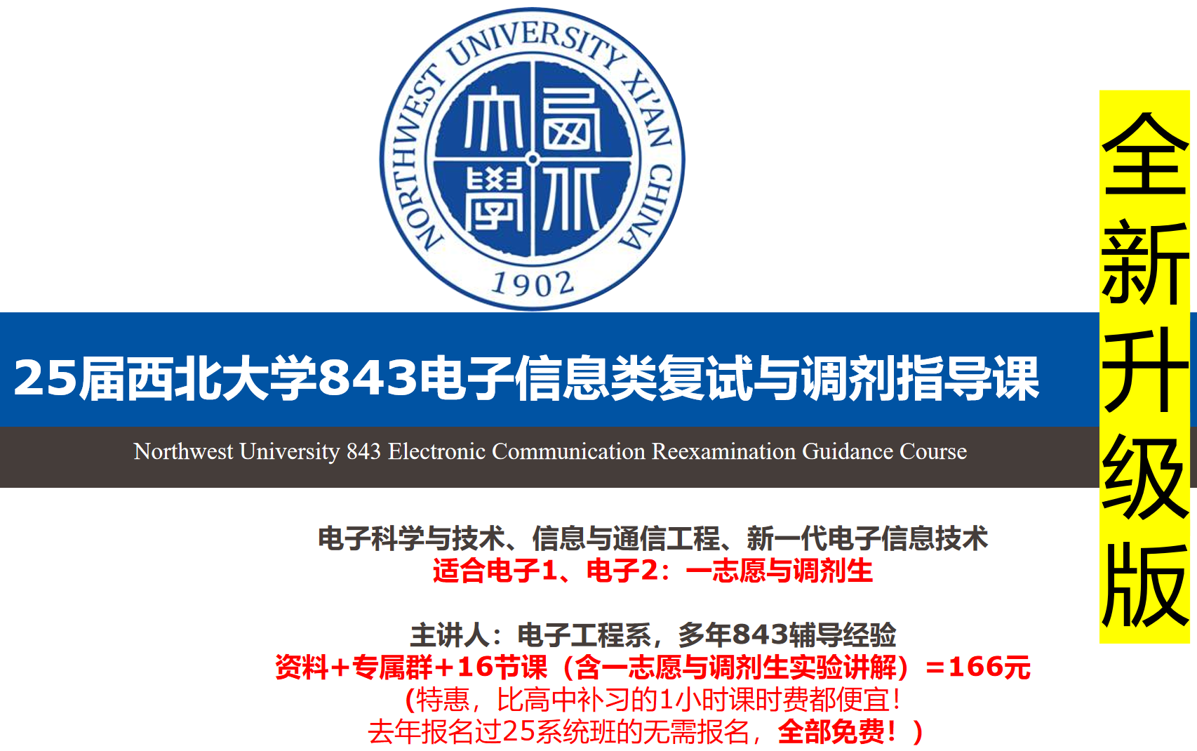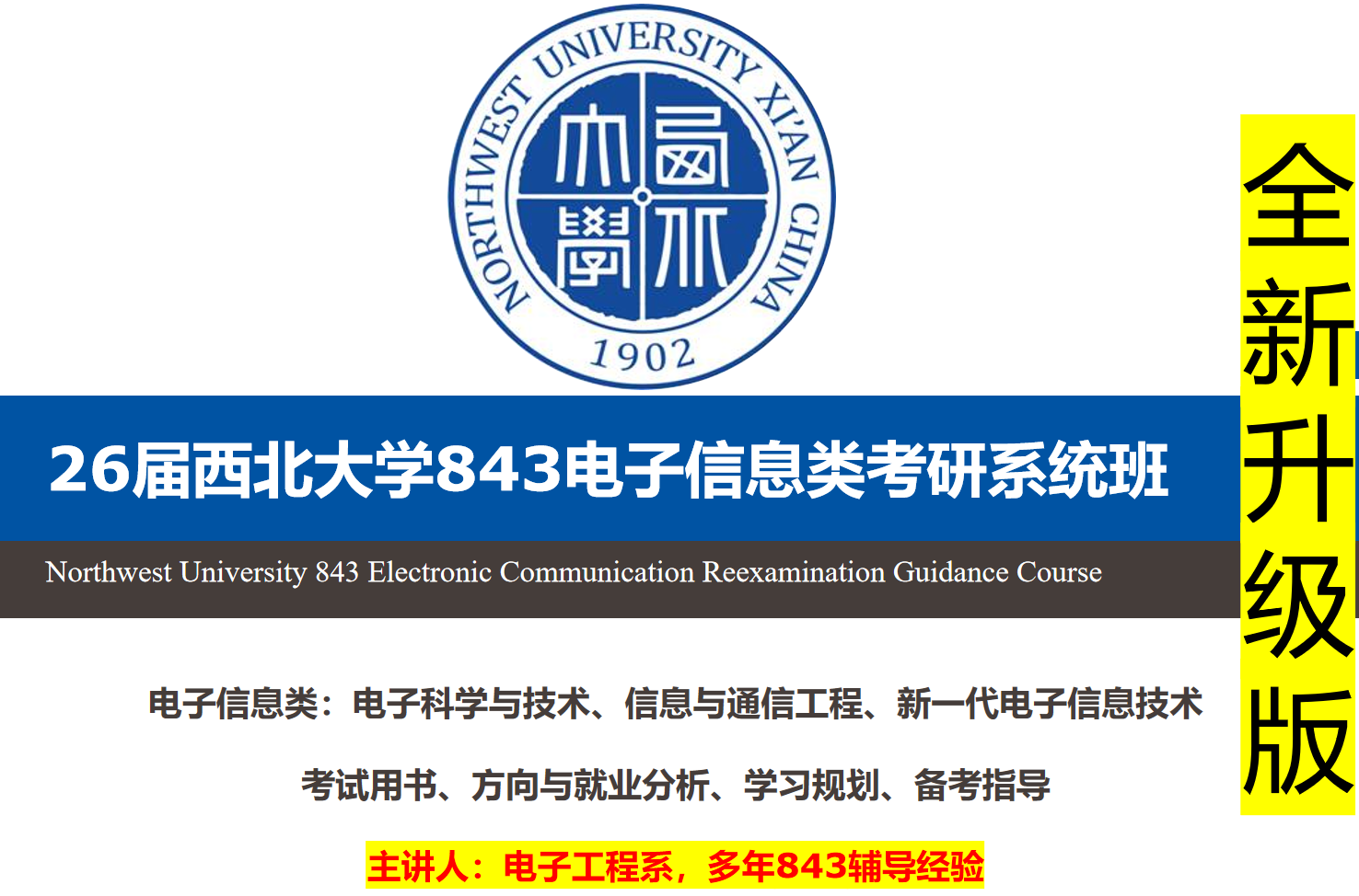 刘航宇老师:多年电子系统设计与考研培训经验,硕士毕业于西北大学电子工程系,中国电子学会与中国人工智能学会会员,专业FPGA工程师,嵌入式实验助教,专业指导C与Verilog程序,专利5项(2项发明型,其中一项为芯片发明),原信息学院研会主席(2025年信息学院拆分为电子学院何计算机学院),研究生电子设计大赛国奖;所带843考研学生专业课平均成绩110分以上。